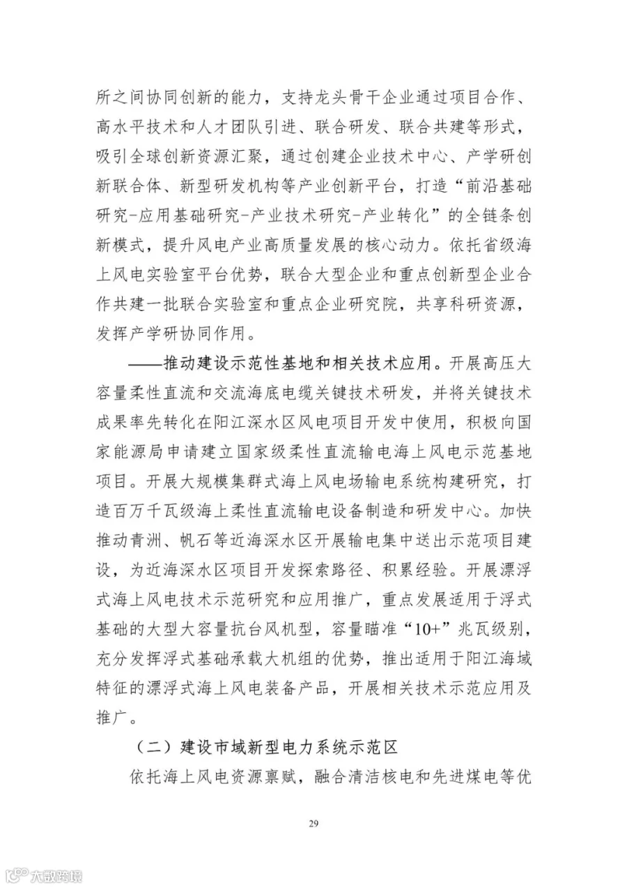 ——推动建设示范性基地和相关技术应用。开展高压大容量柔性直流和交流海底电缆关键技术研发,并将关键技术成果率先转化在阳江深水区风电项目开发中使用,积极向国家能源局申请建立国家级柔性直流输电海上风电示范基地项目。开展大规模集群式海上风电场输电系统构建研究,打造百万千瓦级海上柔性直流输电设备制造和研发中心。加快推动青洲、帆石等近海深水区开展输电集中送出示范项目建设,为近海深水区项目开发探索路径、积累经验。开展漂浮式海上风电技术示范研究和应用推广,重点发展适用于浮式基础的大型大容量抗台风机型,容量瞄准“10+”兆瓦级别,充分发挥浮式基础承载大机组的优势,推出适用于阳江海域特征的漂浮式海上风电装备产品,开展相关技术示范应用及推广。