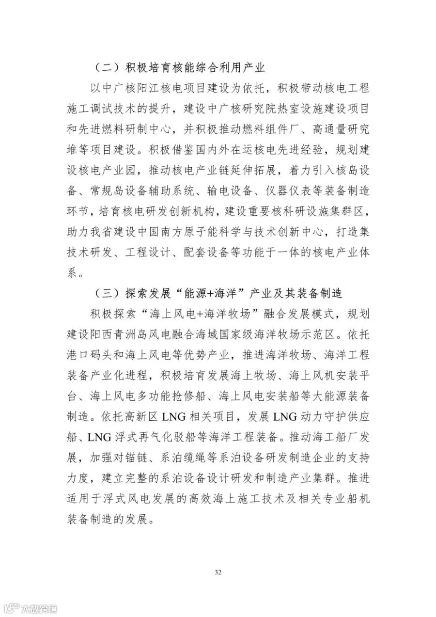 积极探索“海上风电+海洋牧场”融合发展模式,规划建设阳西青洲岛风电融合海域国家级海洋牧场示范区。依托港口码头和海上风电等优势产业,推进海洋牧场、海洋工程装备产业化进程,积极培育发展海上牧场、海上风机安装平台、海上风电多功能抢修船、海上风电安装船等大能源装备制造。依托高新区LNG相关项目,发展LNG动力守护供应船、LNG浮式再气化驳船等海洋工程装备。推动海工船厂发展,加强对锚链、系泊缆绳等系泊设备研发制造企业的支持力度,建立完整的系泊设备设计研发和制造产业集群。推进适用于浮式风电发展的高效海上施工技术及相关专业船机装备制造的发展。
