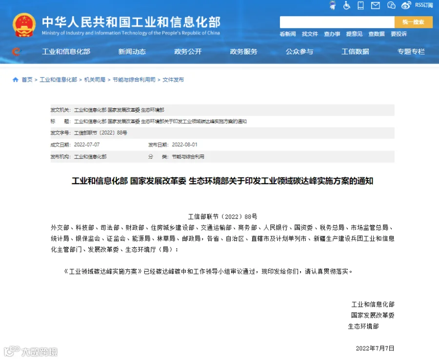 工信部等三部门联合印发《工业领域碳达峰实施方案》