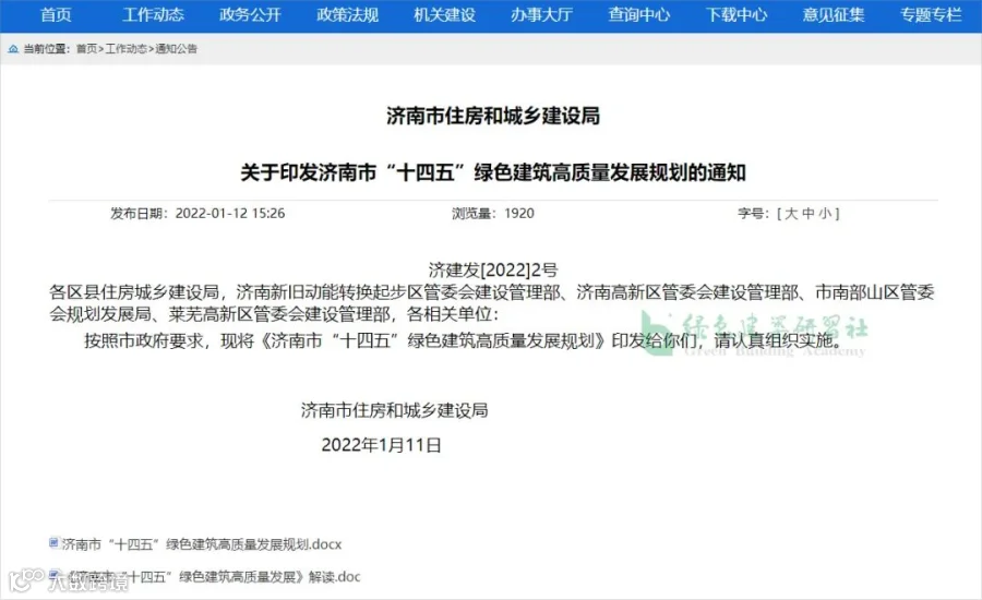 2022年1月11日,济南市住房和城乡建设局印发《济南市“十四五”绿色建筑高质量发展规划》。