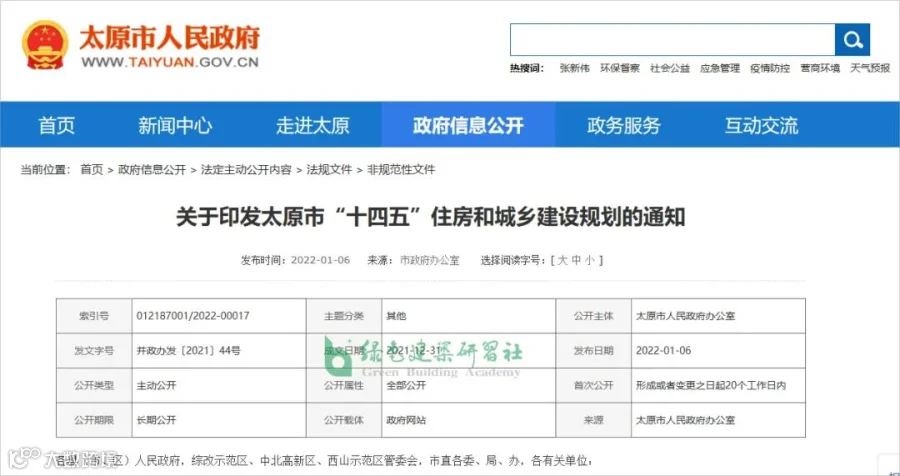 2022年1月6日,太原市人民政府官网发布《太原市“十四五”住房和城乡建设规划》。