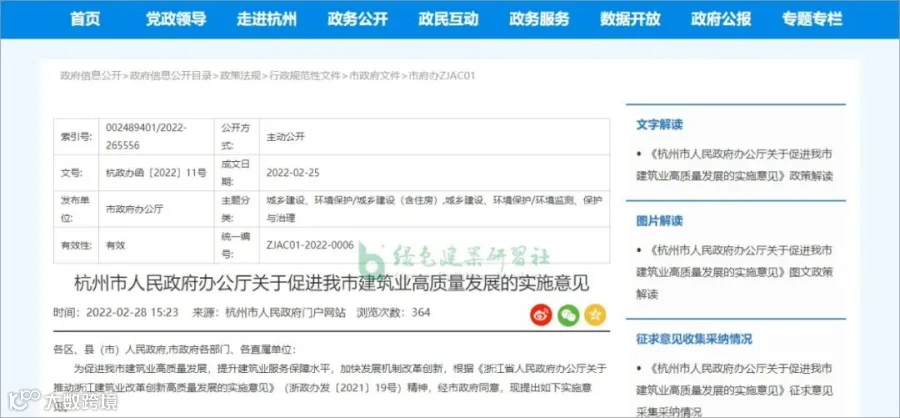 2022年2月25日,杭州市人民政府办公厅印发《关于促进我市建筑业高质量发展的实施意见》。