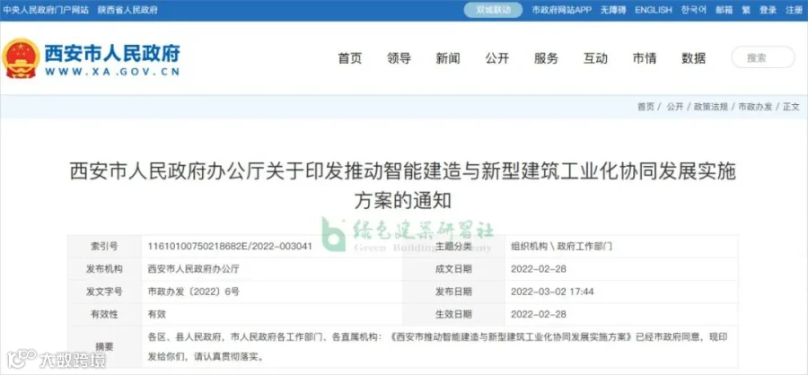 2022年2月28日,西安市人民政府办公厅印发《西安市推动智能建造与新型建筑工业化协同发展实施方案》。