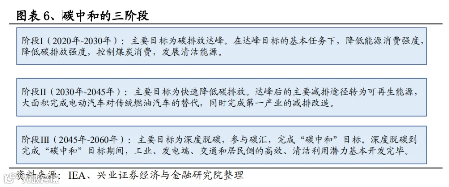 据此,结合我国的承诺的时间节点:1)从现在至 2030 年,我国的碳排放仍将处于一个爬坡期;2)2030-2060 年这 20 年间,碳排放要渡过平台期并最终完成减排任务。