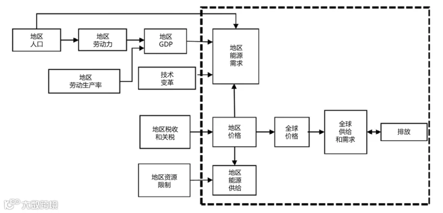 在GCAM中,二氧化碳排放量与全球能源需求和消耗紧密相关,在这其中人口和生产效率是能源需求的关键主导因子。但同时能源需求会受到技术发展和能源价格的影响:技术越先进,每增长单位GDP所需的能源消耗越低;如果能源价格过高,市场对该资源的需求将会降低,而能源价格与产能区域的能源资源和关税的密切相关。