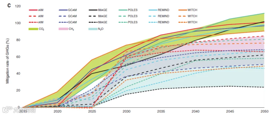 不同模式计算出来的,在1.5℃温控目标下的碳排放量相对于没有政策管控条件下的碳排放量的百分比。