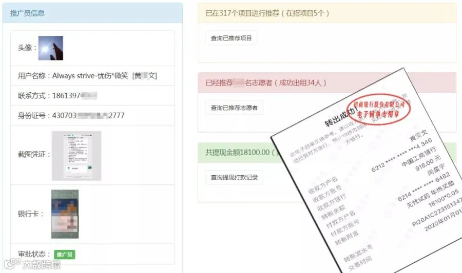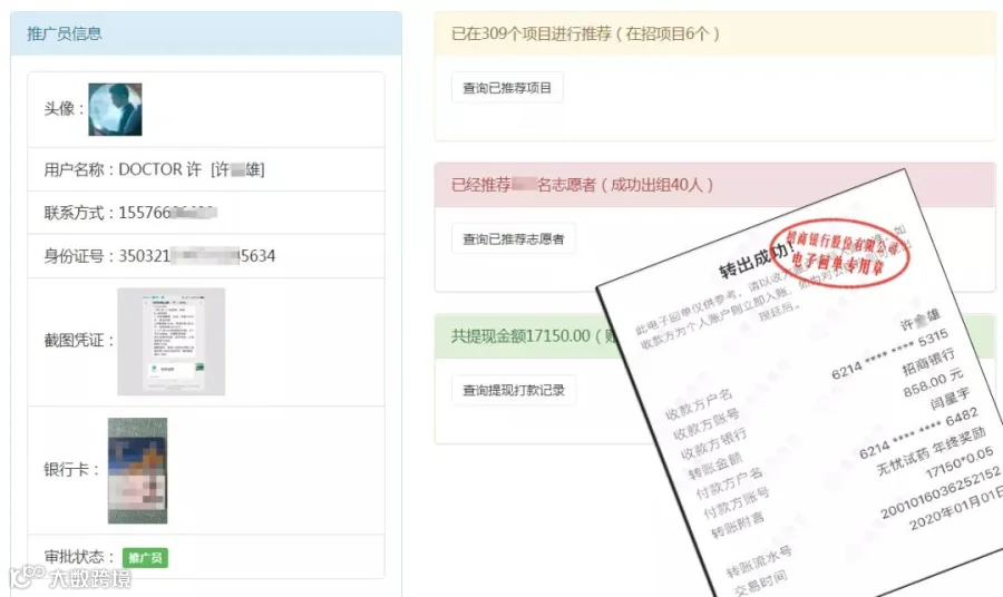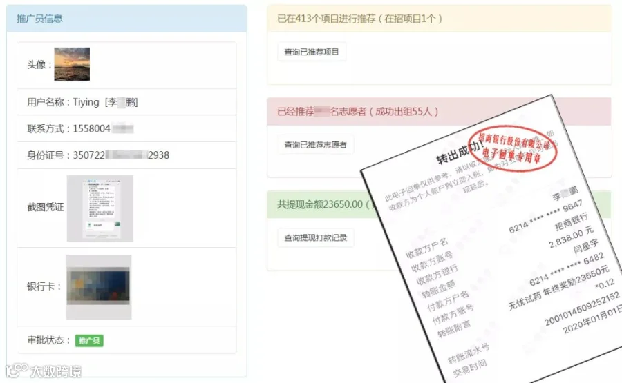 <另外发邀请面试函,邀请金牌推广员李X鹏全职加入无忧试药>