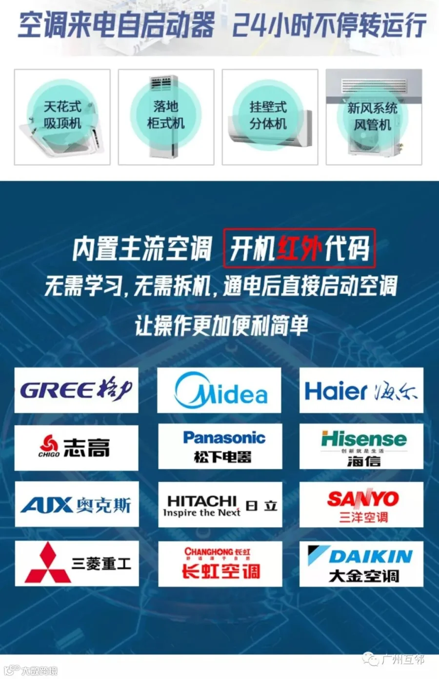 广州互邻是一家集家用空调、中央空调、空调自动控制器销售以及工程设计、安装和售后服务于一体的公司。
