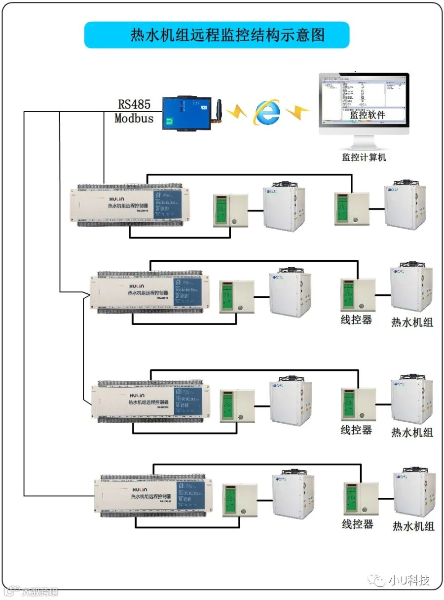 如上图所示,控制器与热水机组间采用有线,把各项参数及数据集中到控制器上,控制器把数据通过无线串口服务器DTU把数据传输到云端服务器上,监控端电脑联网后可接受所有数据,进行远距离监控热水机组。