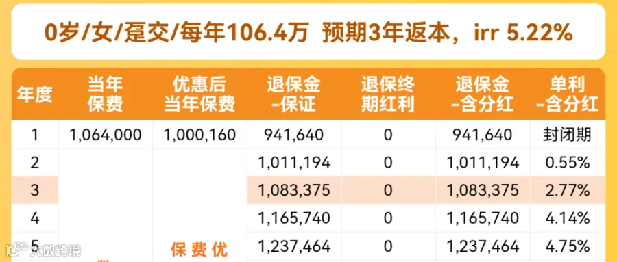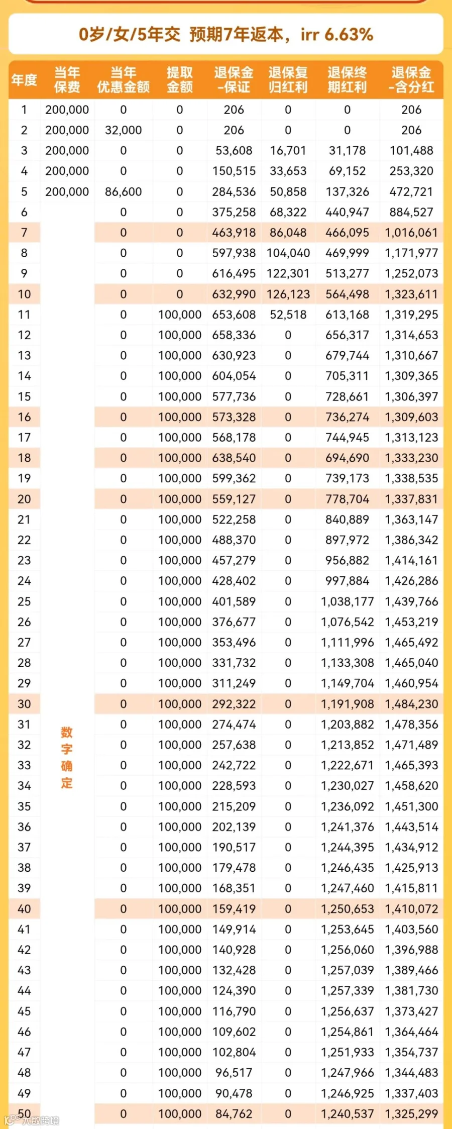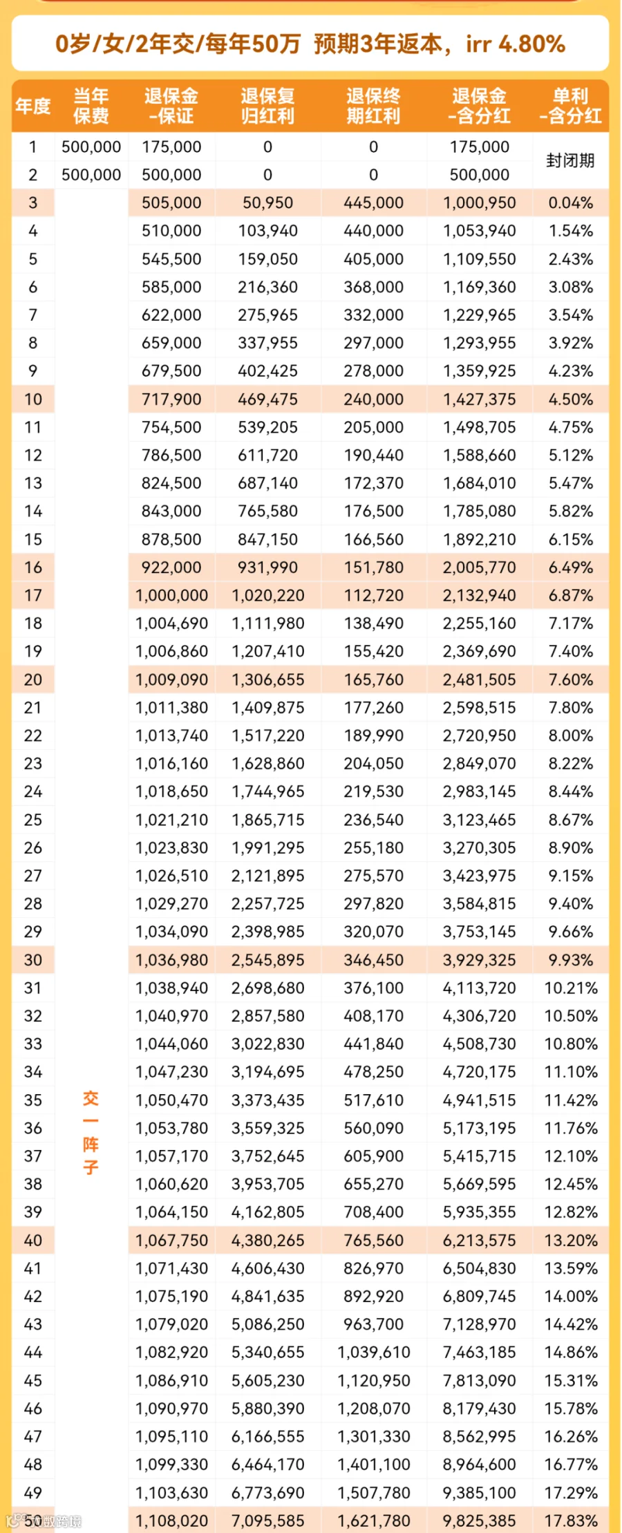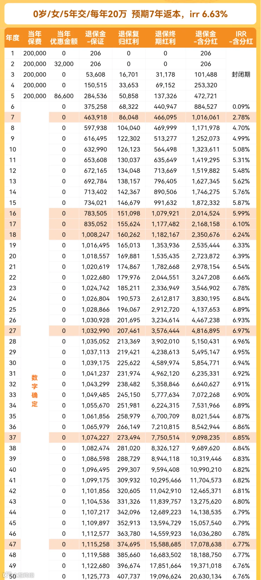 2年每年50万,共存100万, 10年预计增长到156.3万,20年预计增长到319万,算上不错的保费折扣和预缴优惠后,长期收益可达 6.5%到7%