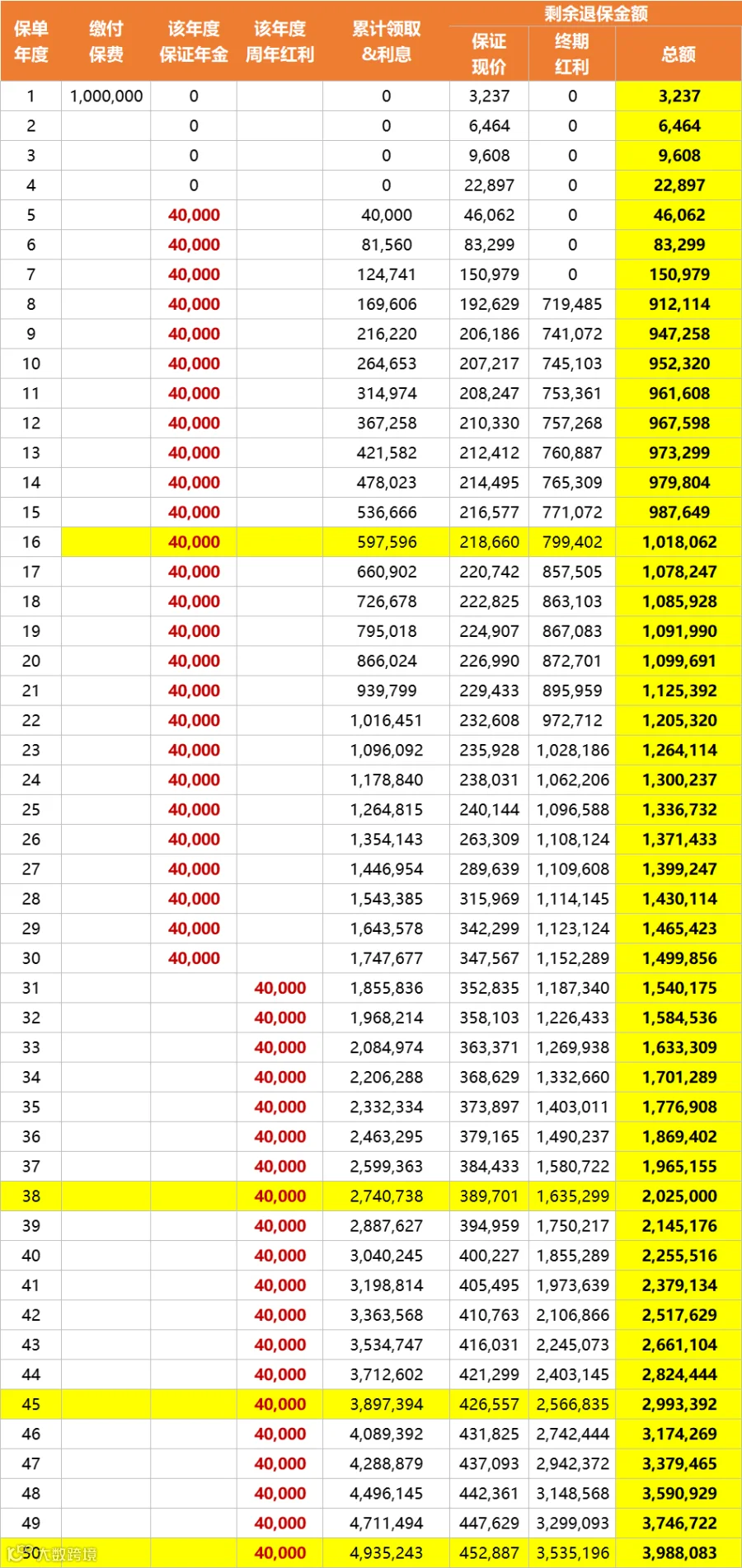 一次性存100万,第5-30年,每年保证派4万年金,30年后每年派发4万周年红利,假设领取到第50年,除领走的年金外,预计本金还能从100万增值到398.8万。