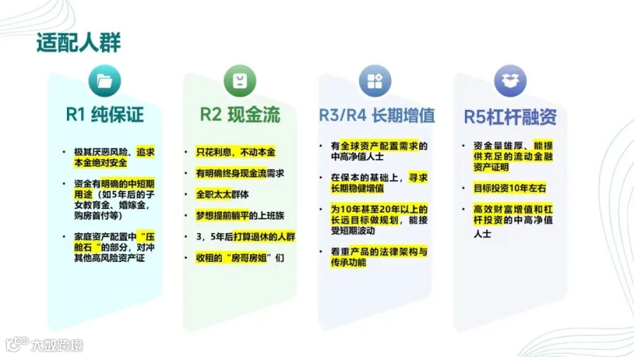 2.理解波动,匹配性格:务必看清“保证”与“非保证”的比例。如果你属于看到分红短期波动就焦虑的人,那么R1/R2可能比R3/R4更适合你