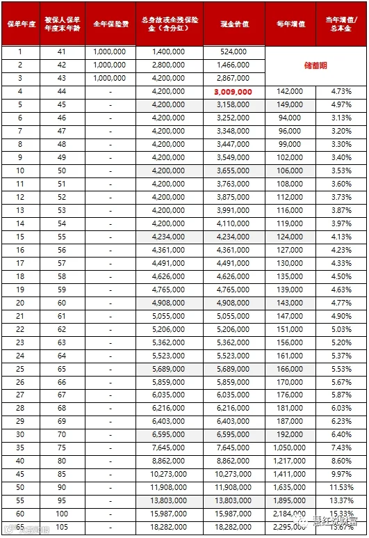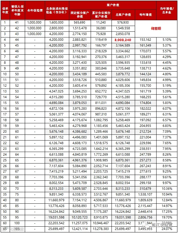 02. 保证部分预定利率2.5%+分红, 3年年存100万, 前4年是储备期,第4年预期现价超过本金,之后每年增值部分相比本金,增值四五个百分点,比银行存款单利高多了,时间越长,增值百分比越高, 大家可以看最后一列当年增值/总本金