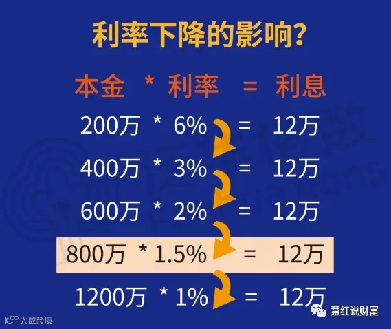 同样的12万利息,当利率从6%跌到1%,虽然利率只差了5%,却造成1000万本金总值的损失。