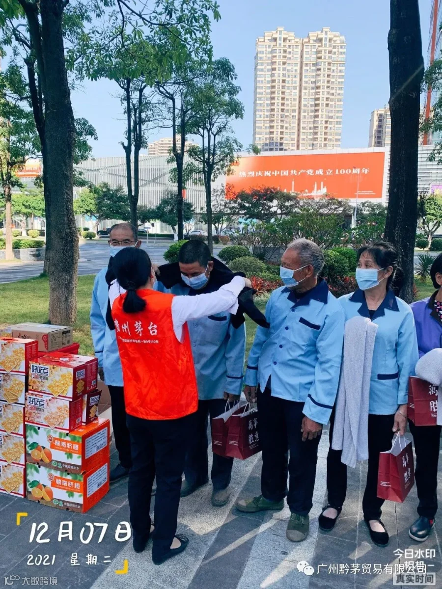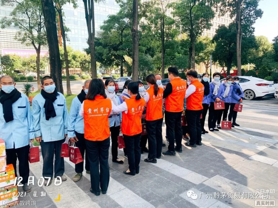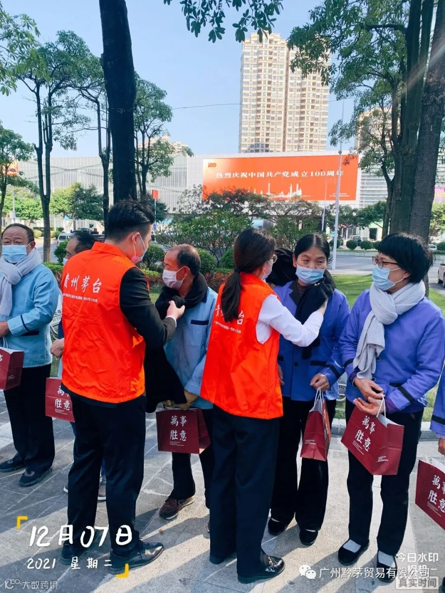 随着近期温度的逐渐下降,天气虽在变,但关怀不变。广州黔茅贸易有限公司在2021年12月7日开展”冬日送温暖,行动暖人心“活动,为环卫工人、保洁员送去特别的关注与温暖。此次活动旨在提高公司员工乐于奉献的精神以及自觉服务的意识,发扬中华民族的传统美德,维护好公司及茅台的企业品牌形象。