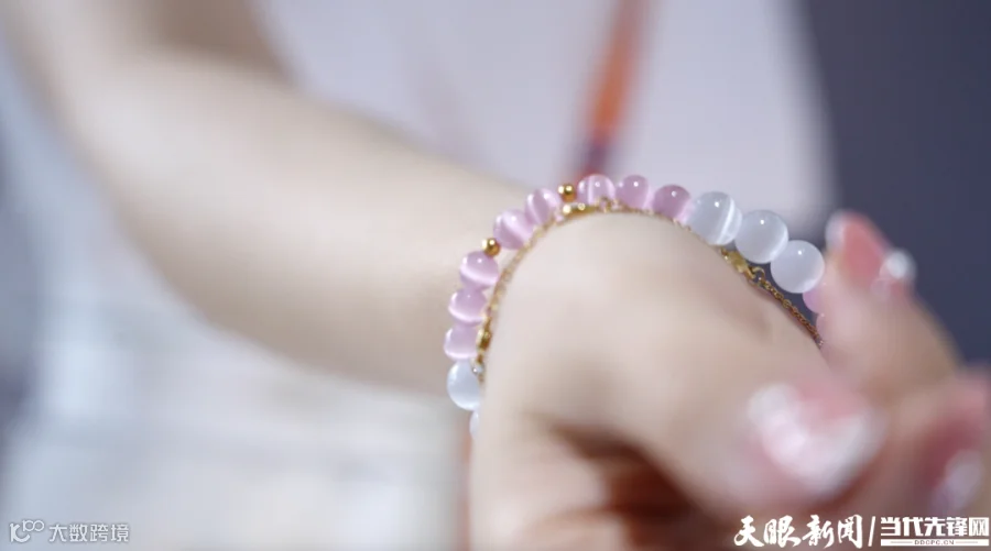 灯光下,这条粉白相间的水晶手链熠熠生辉,精致的小房子和喜鹊样式的吊坠为手链增添了设计美感,也赋予了美好寓意。