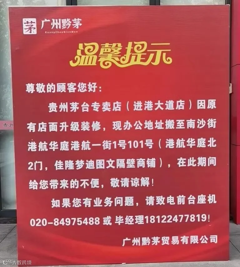 贵州茅台专卖店(进港大道店)因原有店面升级装修,现办公地址搬至南沙街港航华庭港航一街1号101号(港航华庭北2门,佳隆梦迪图文隔壁商铺),在此期间给您带来的不便,敬请谅解!