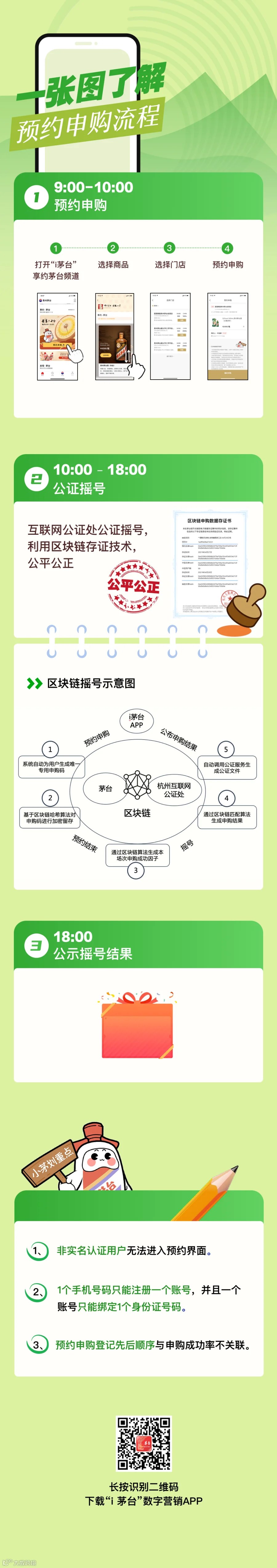 “i 茅台”支持消费者在线注册、实名认证、线上线下支付、取消退款、门店提货等。申购成功的消费者需要携带本人身份证到指定的社会渠道商及茅台自营公司提货。