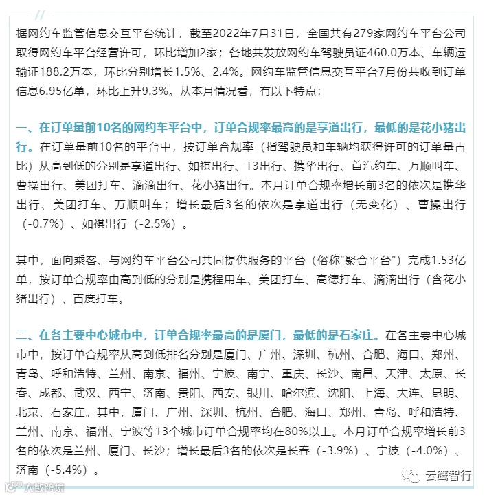 网约车监管信息交互平台发布2022年7月份网约车行业运行基本情况(交通部公布数据)