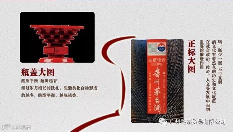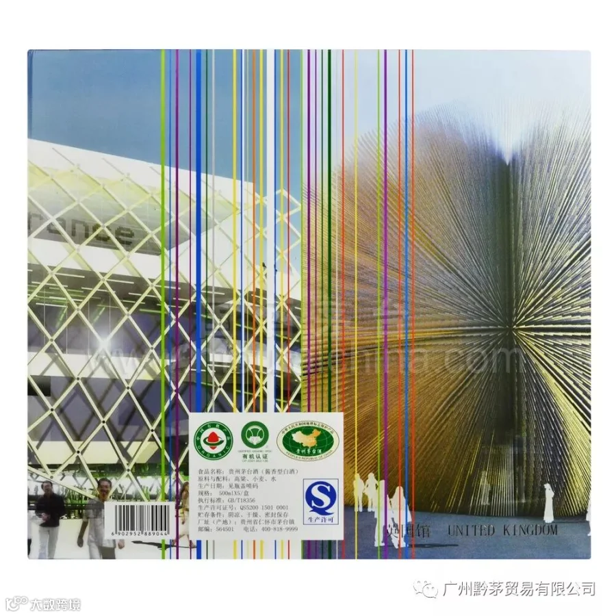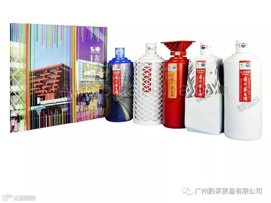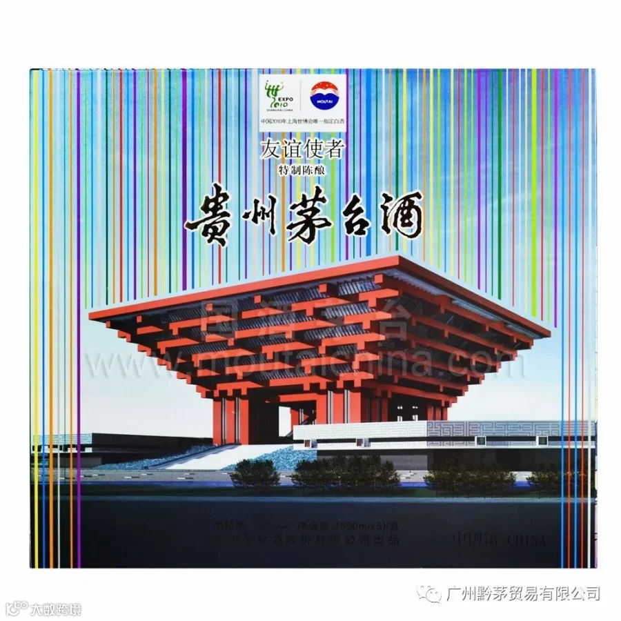 贵州茅台酒(友谊使者),外观构图新颖,色彩典雅,别具一格。与联合国五个常任理事国上海世博会场馆相结合,展现其世博场馆的主题: