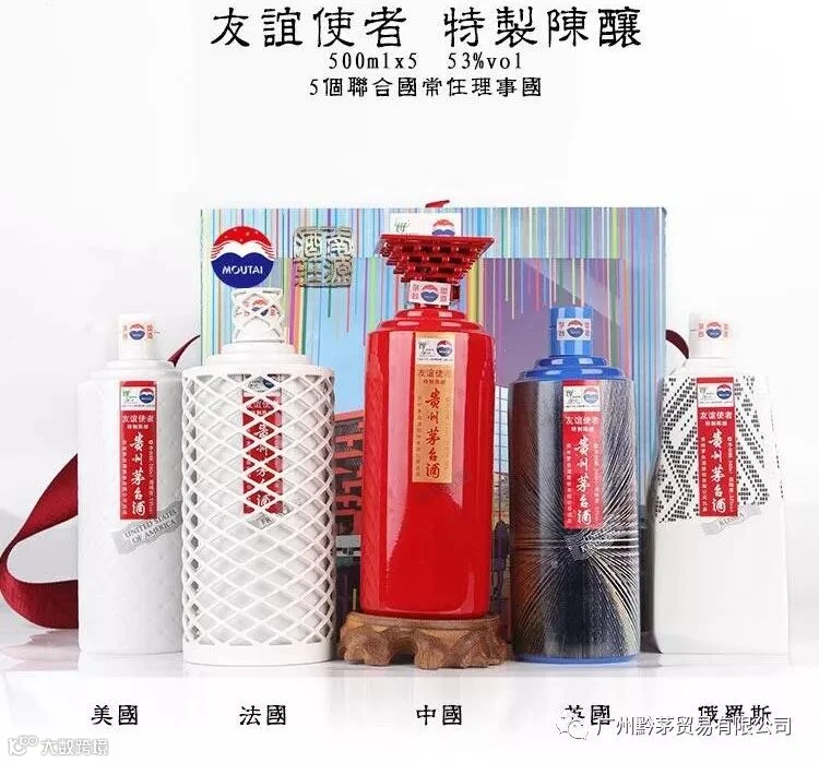 友谊使者传承中国优秀文化底蕴,传递和平、美好、平等互助。《友谊使者》系贵州茅台酒股份有限公司为联合国五个常任理事国特别奉献的茅台陈酿特制酒,每年限量10000套。