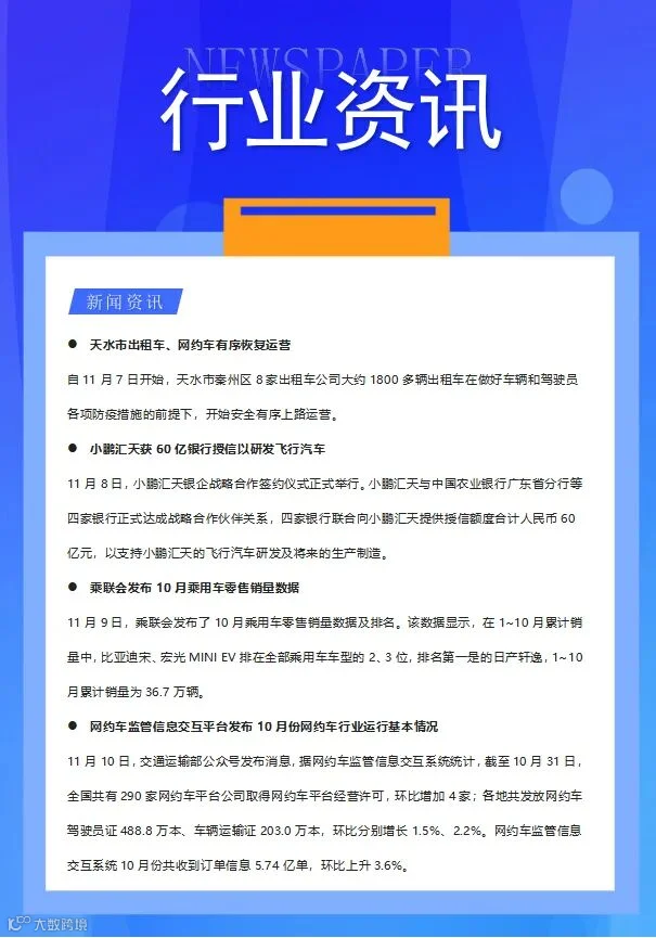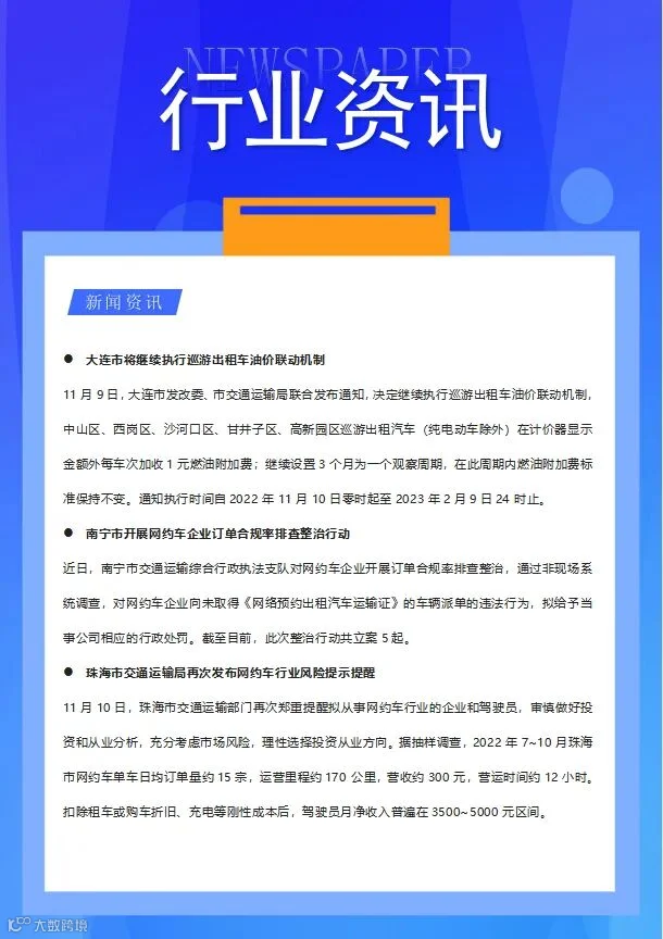 导读:网约车行业资讯(11.07-11.11)#大连市将继续执行巡游出租车油价联动机制#南宁市开展网约车企业订单合规率排查整治行动#天水市出租车、网约车有序恢复运营#网约车监管信息交互平台发布10月份网约车