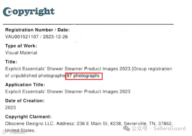 此外,诉状还指出案件涉及原告于2023年12月26日在美国成功注册版权编号VAu 1-521-107的97张照片。原告官网explicitessentials.com上展示的相关图片可作参考。