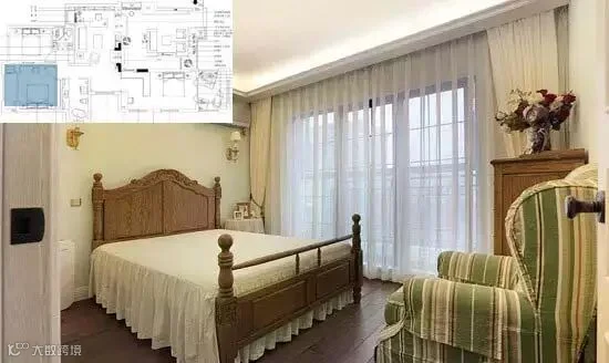 点评:连接阳台的四折门采光性能较好,其百叶设计还能够很好地保护卧室隐私。