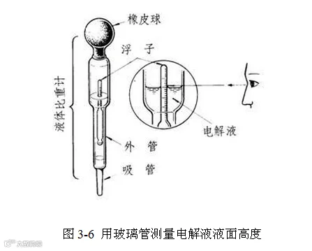 液面高度可用玻璃管测量,如图3-6所示。电解液液面应高出极板l0 mm一15mm,电解液不足时应加注蒸馏水。注意:除非确知液面降低是由于电解液溅出所致,否则一般不允许加入硫酸溶液。