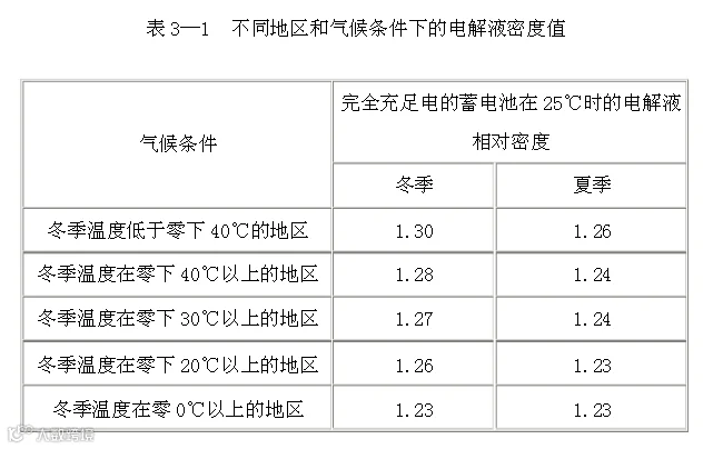 电解液的密度对蓄电池的工作性能影响很大,密度大,在一定程度上可以提高蓄电池的容量,而且电解液不易结冰。但密度过大,由于电解液粘度增加,渗透性变差,蓄电池的容量下降,而且会降低蓄电池的使用寿命。电解液的密度随地区和气候条件而定,表3—1列出了不同地区和气候条件下的电解液密度值。