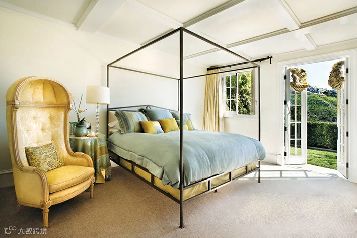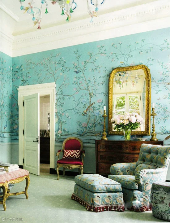 当来自美国的Tiffany蓝遇到法式中国风 (Chinoiserie),跨地域的多元风情扑面而来,花鸟图案世界更是让人赏心悦目,呈现出清新的浪漫、优雅的高贵气质。金色和浅珊瑚色装饰能为卧室增添色彩斑斓的活力。