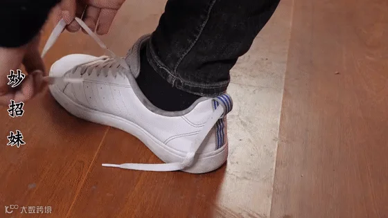 我们可以把鞋带往后面的“小尾巴”里绕一圈,然后再绑紧鞋带,这样可以很好的固定鞋子和脚。