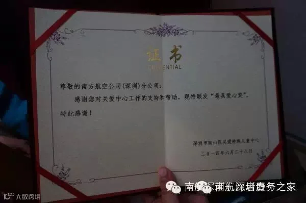 关爱中心也为南航青年志愿者协会深圳分会颁发了“最具爱心奖”证书。