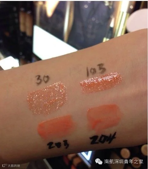 YSL gloss volupte 橙色系试色。203、204全球近乎断货。请看30和103,图2是叠加在金圆管口红33之上。1号纯金加什么都很美哦!