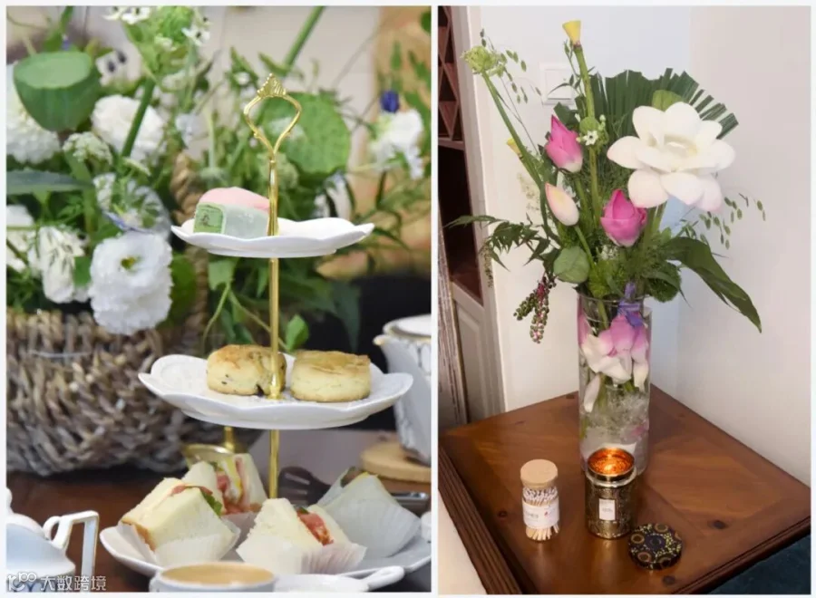 换上管家服,带上白手套,妥妥的职业感就出来了。客人晚了半小时抵达,迎宾、引入座位、斟茶、上三层架,一套操作下来自己都觉得很丝滑。客人当面夸赞:布置的好漂亮、好专业!