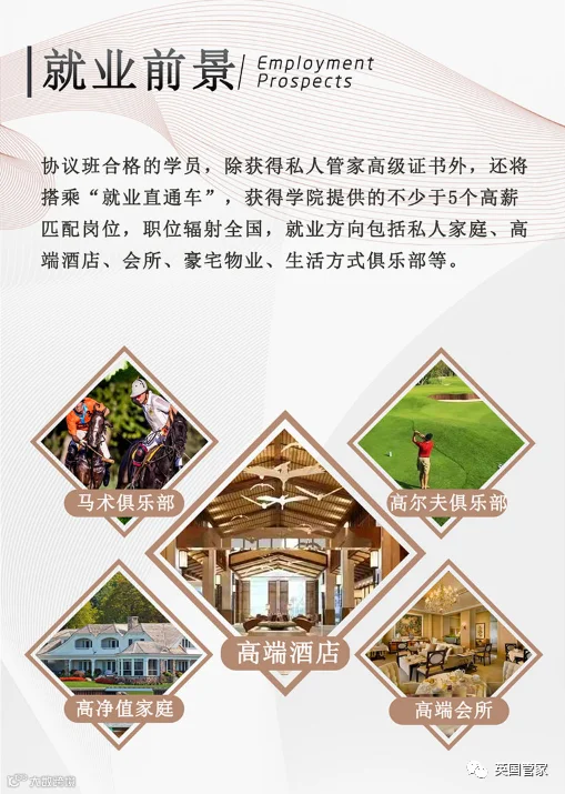 通过协议班考核的学员,除获得“中国家庭服务业协会”(http://pxzs.chsa.com.cn/)与“英国管家协会”联合认证发布的私人管家高级证书。还将搭乘“就业直通车”,获得学院提供的5个以上国内匹配岗位,职位辐射全国。就业方向包括私人家庭、高端酒店、会所、豪宅物业、生活方式俱乐部等高端环境。