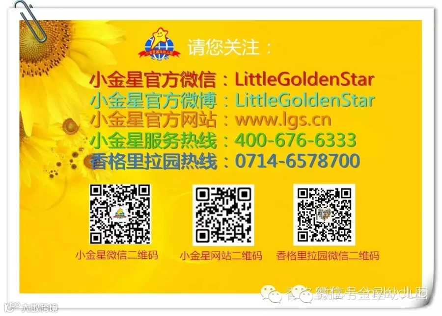 「小金星国际幼儿园」在中国全资开办近百所直营连锁双语幼儿园,致力于打造中国学前教育优质品牌。"小金星"秉承「爱心教育、开蒙养正、服务社会、培养新生」的办学宗旨,融汇中华传统文化精髓与国际先进教育理念,形成了「中英双语教学,科学艺术启蒙」的办园特色。「小金星」为热爱幼教的有志之士,提供了广阔的事业发展平台;为同一片蓝天下的孩子,插上了理想和智慧的翅膀,是孩子们快乐成长的乐园。