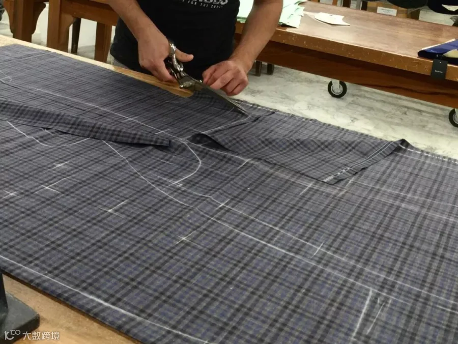 在这里即使是面料的裁剪都采用了最原始的方式,先借助“Pattern”在面料上以粉笔标记,再以人手裁剪,这看似简单,实则不然,条格面料在裁剪时不仅要做到左右完全对称,更要兼顾衣袖,衣领,衣身每个接缝处的条格对齐,最重要的,所有的细节都要考虑到整体的美感,失之毫厘,谬之千里。