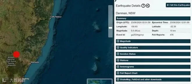 •悉尼澳洲地球科学局(Geoscience Australia)官网数据显示,近日,在位于悉尼西北的Denman发生5级地震,震源深度10公里。震中位于Upper Hunter地区的矿业小镇Denman附近的Wollemi National Par,距离悉尼约250公里。超过2,500人向Geoscience Australia报告了震感,其中就包括一些居住在Coffs Harbour、悉尼和堪培拉的居民。地震学研究中心的专家Adam Pascale表示,这是自1994年以来该地区最大的一次地震,并且“每隔几分钟”就会记录到余震。