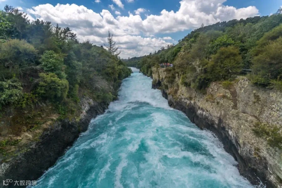 离开Rotorua南下Taupo,胡卡瀑布就位于陶波湖的下游。清澈的湖水形成了怀卡托河之后,突然变窄,陡然从悬崖峭壁中穿过,泡沫般的水瀑倾泄而下,故当地人称它为“Huka”——泡沫。