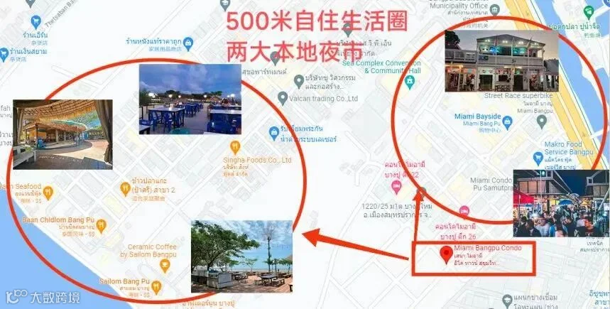 目前【迈阿密海景小镇】最近的BTS站点是BTS-kheha(E23)站,距离3公里,坐摩托车/小车过去大概5~8分钟左右,平时用手机软件Grab就能马上叫到车。