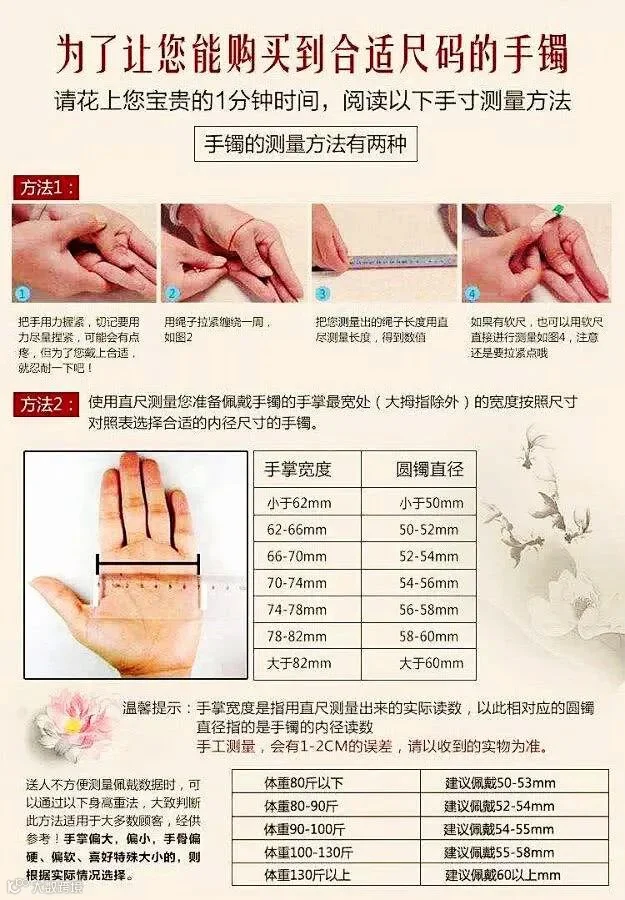 一:把手自然放平,不要绷紧,用一根线围手掌最宽处的周长,量的时候如果手很软的女士可以量紧点,手骨偏硬的可以量到刚好把线拉紧的程度即可,最后量出线的长度就是你的手寸大小了。量出的周长除以3.14,再加1~2mm即是适合您的手镯的内径。