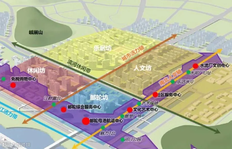 未来,国际邮轮母港片区将建设免税购物中心、邮轮综合服务中心、邮轮母港航运中心、文化艺术中心、社区服务中心和水泥厂文创中心。