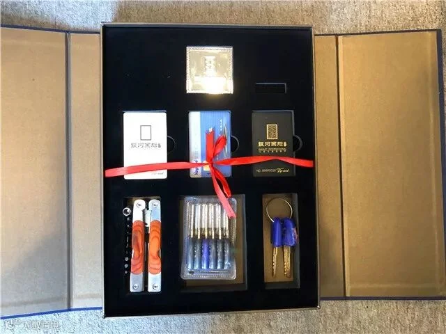礼盒内部由环保聚丙烯板及黑绒布定制而成,构造分割合理,并配置品牌U盘(8g)、家庭式组合工具各一件,便于业主日常生活的应急使用。同时,礼盒的设计在业主后期的生活当中也有很高的实用性。诸如:业主可使用此礼盒储放水、电、燃气卡等缴费类票据等;用此礼盒储放首饰类配件物品;可使用此礼盒储藏茶饼;可使用此礼盒储放家用药品等;可用于精美礼品的包装,提升档次。