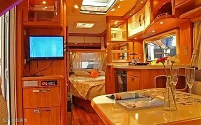 房车,又称"车轮上的家",兼具"房"与"车"两大功能,它是由国外引进的时尚设施车种,其车上的居家设施有:卧具、炉具、冰箱、橱柜、沙发、餐桌椅、盥洗设施、空调、电视、音响等家具和实用电器。