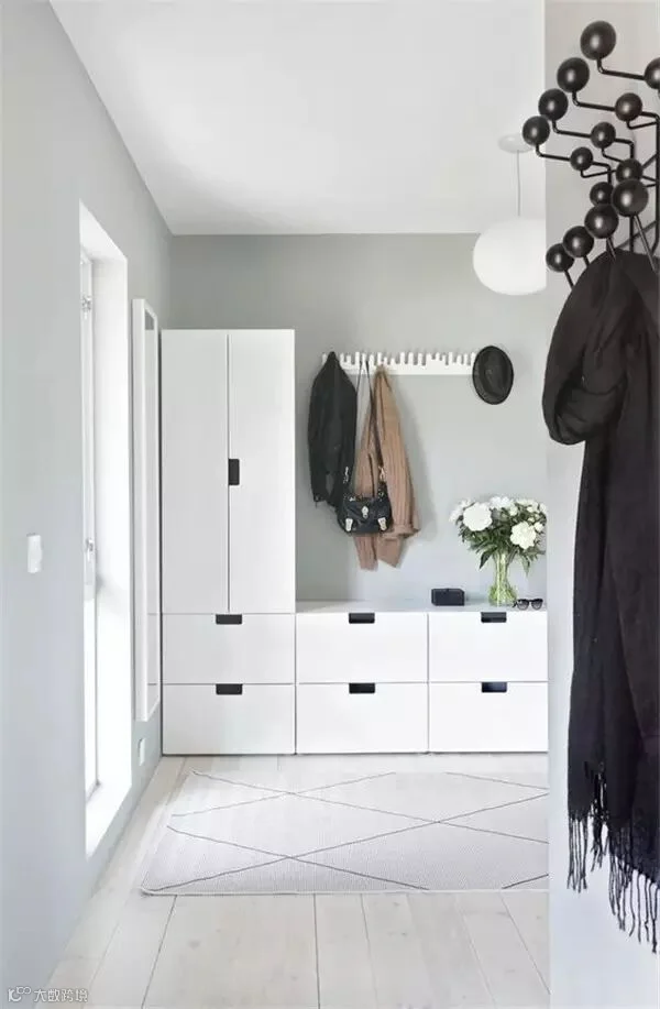 玄关是人们进门来首先看到的空间,也是给客人留下第一印象的地方,所以玄关收纳注重的是实用和氛围的营造,要做到小而美。除了可以用最常见的一体式玄关柜进行收纳,也要多多利用起墙面空间,安装固定的挂架和挂钩,让衣物、提包、钥匙等日常杂物有一个安身之处,简易又出彩,轻轻松松就让面积不大的玄关变成家里实用与美观兼具的收纳空间。