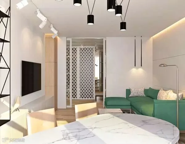 绿色沙发恰到好处的将原本单一色调的空间增添了一抹色彩,是整个空间一下子活跃了起来。