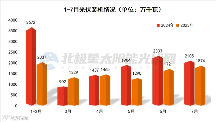 太阳能装机方面,7月新增装机21.05GW,环比上月下降9.77%;1-7则累计新增装机123.53GW。