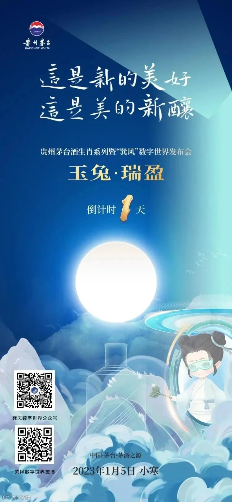 1月5日20:00,玉兔·瑞盈贵州茅台生肖系列暨巽风数字世界发布会结束后,29999份癸卯兔年贵州茅台酒数字藏品和29999份癸卯兔年酱香系列酒数字藏品将在巽风数字世界上线。