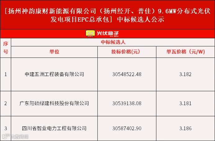 近日,扬州神韵康财新能源有限公司(扬州经开、普佳)9.6MW分布式光伏发电项目EPC总承包中标候选人公示,其中: